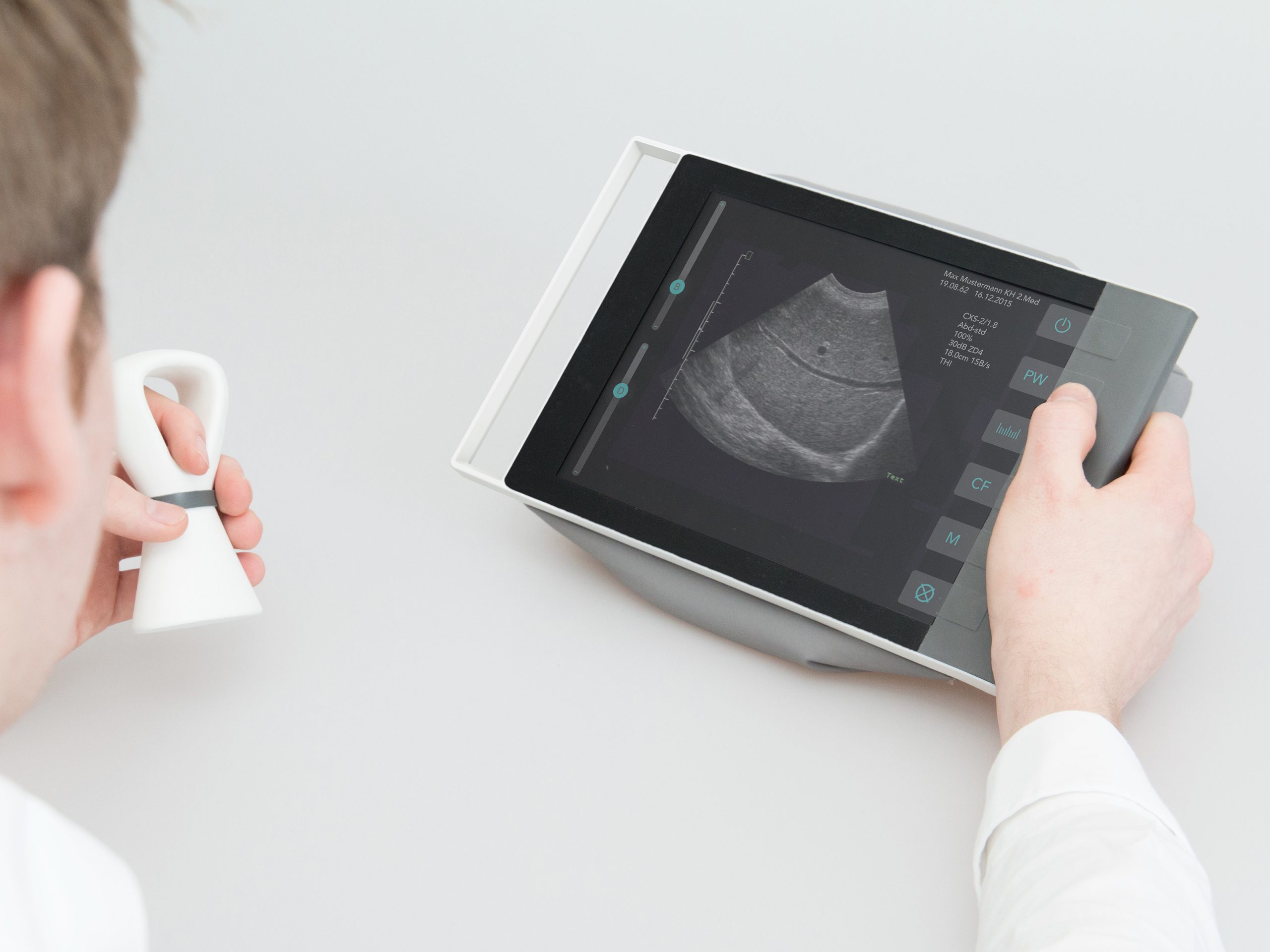 traditionally, the screen of ultrasound devices is separated from the patient, so the doctor has to constantly turn his head to see either the patient or the screen. by being able to place the device close to the patient, the doctor is able to work in one line of sight.
